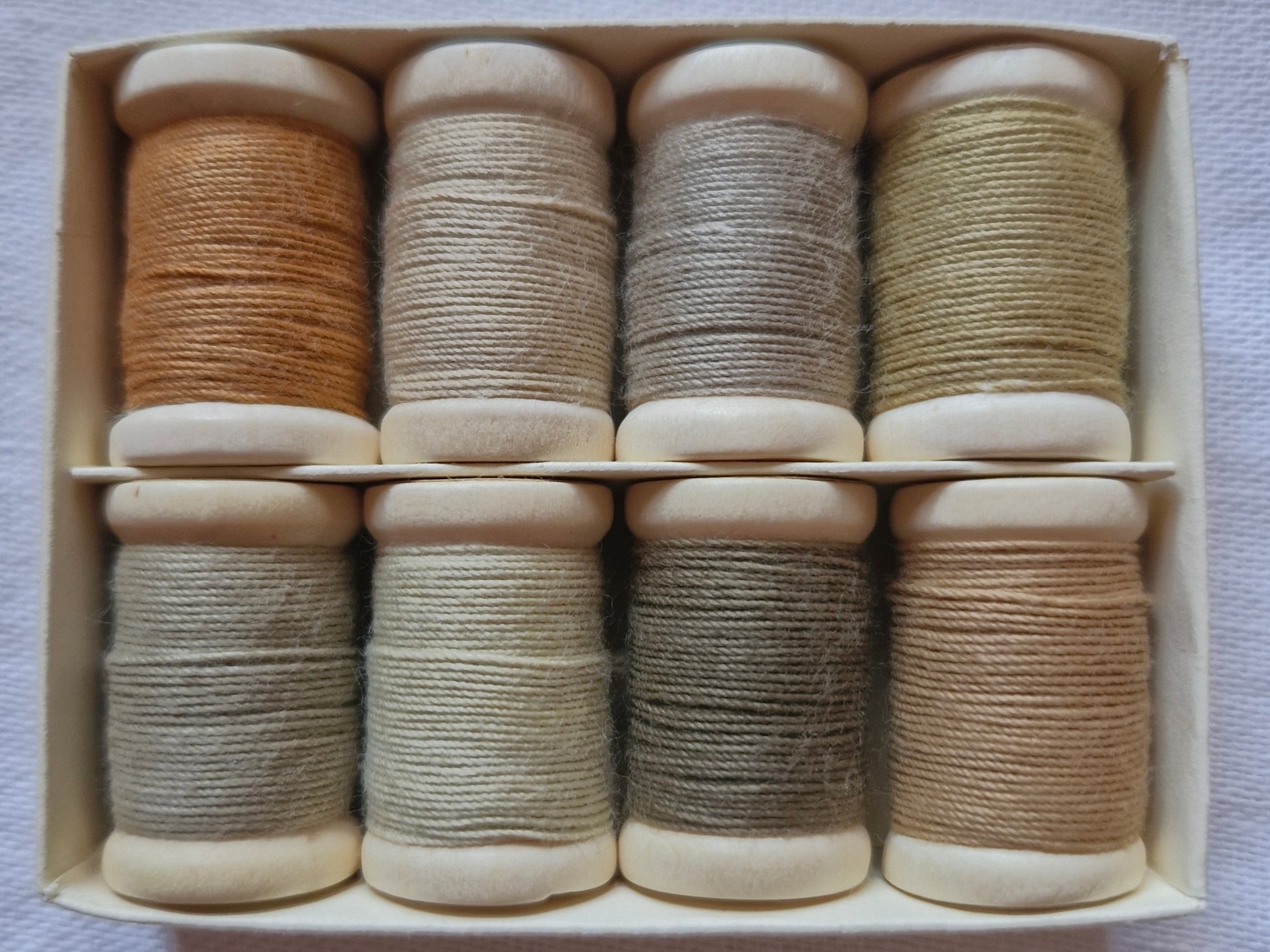 Hilados de algodón pima teñidos con tintes extraidos de la flora tintórea del secano costero, en algunas de sus posibilidades cromáticas.