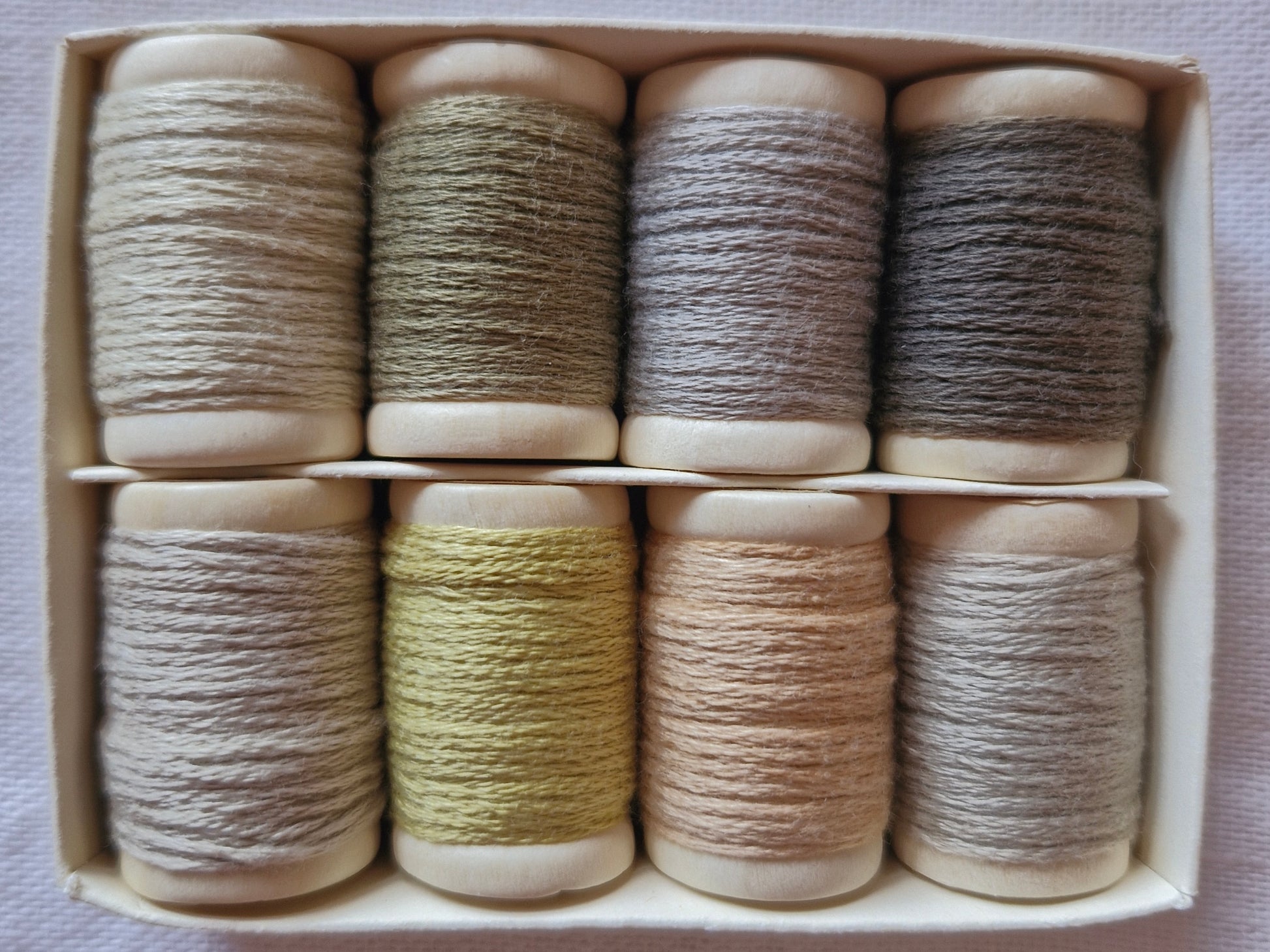 Hilados de algodón pima teñidos con tintes extraidos de la flora tintórea del secano costero, en algunas de sus posibilidades cromáticas.